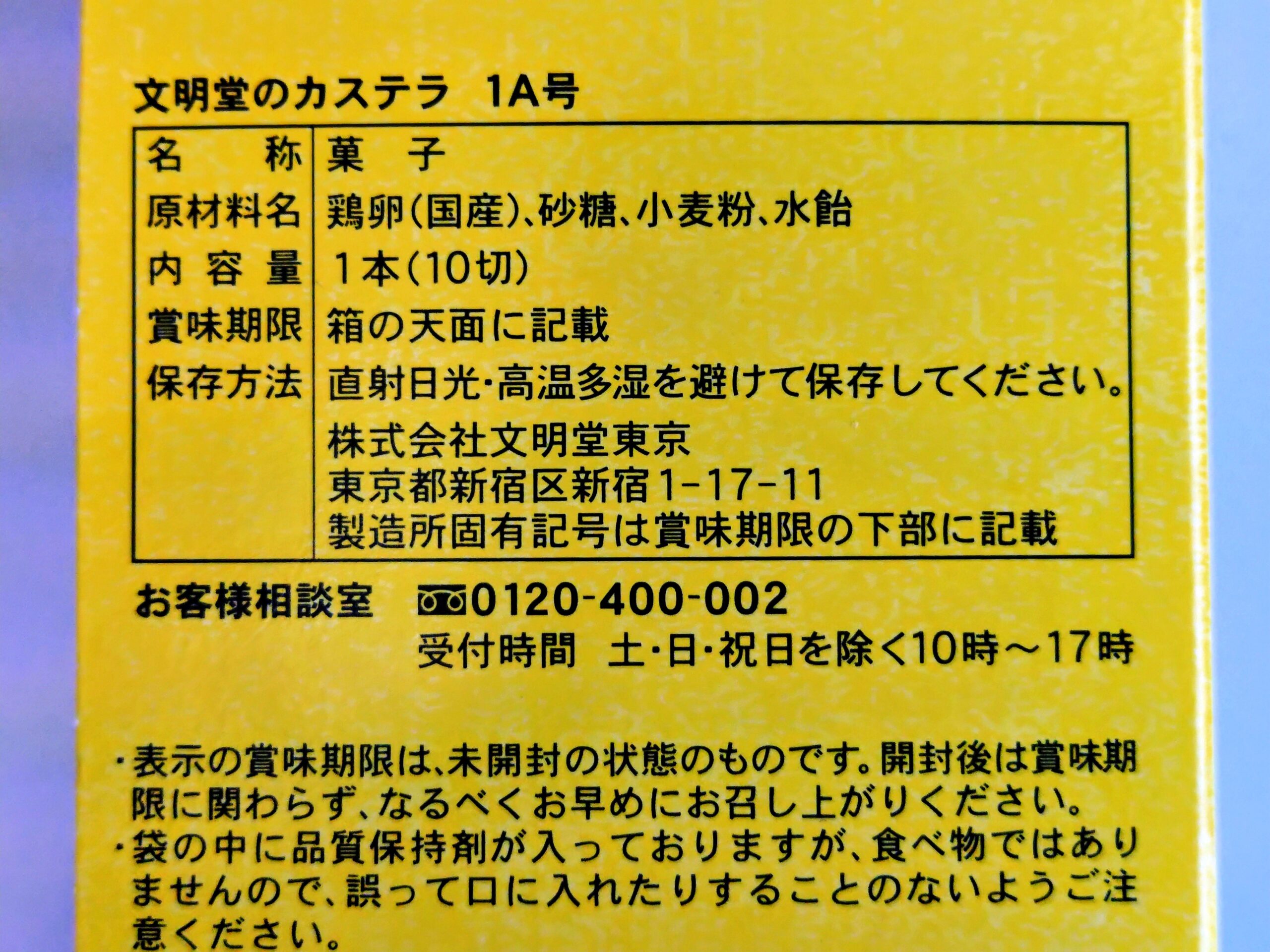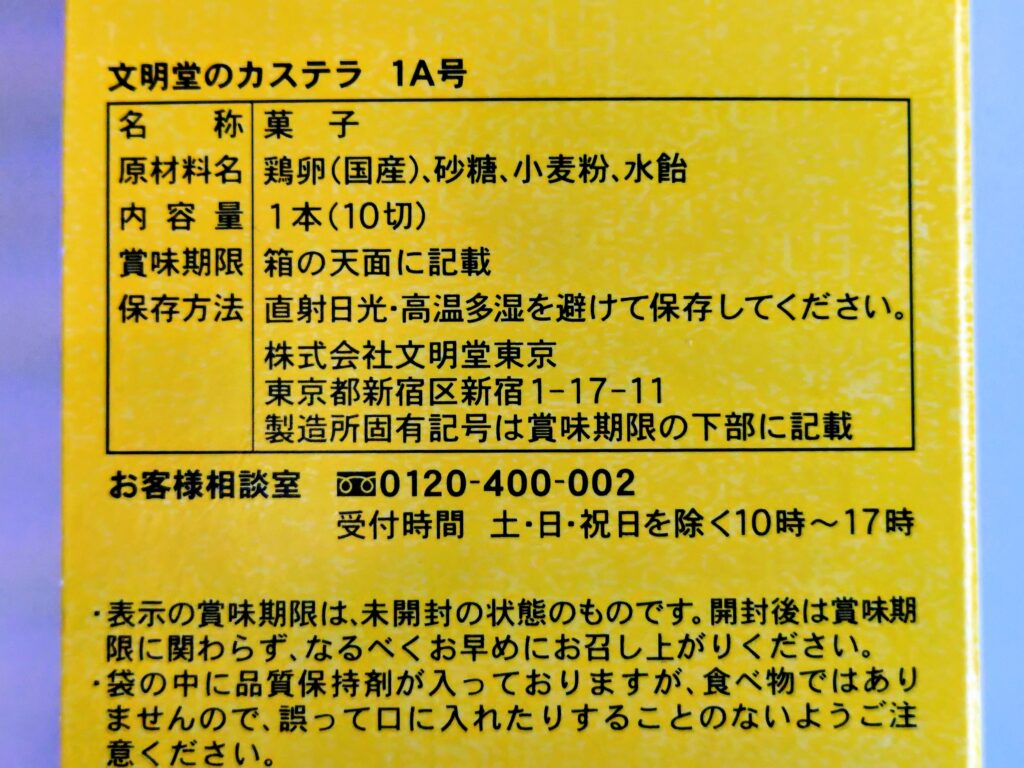 カステラの成分表示。
